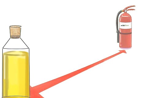 Put out oil and fat fires. Never use a water extinguisher to put out cooking oil or a fat fire. A BE fire extinguisher is recommended to have in kitchens. It is best to place it in the path you use to leave the kitchen, such as the kitchen door. When using a powder extinguisher on burning cooking oil or fat it is recommend you stand two meters away from the fire and aim over the pan. Do not aim the extinguishant directly into the pan that contains the oil or fat because it might spread the fire around the kitchen.