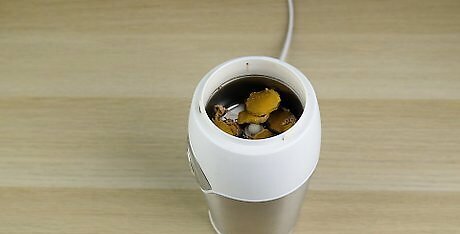 Transfer the dried roots to a large grinder. A spice grinder or coffee grinder will work fine for this. A food processor can also get the job done. Fill up the grinder about halfway with roots. You may need to grind the turmeric in batches if you're working with a lot of it. Keep in mind that turmeric has a strong flavor and it stains, so you may not want to use your everyday coffee grinder for this.