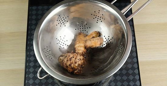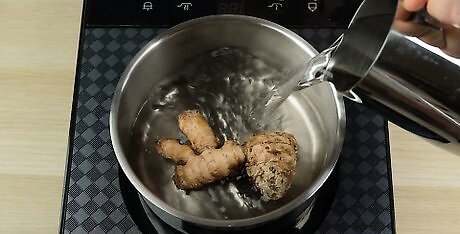 Place the turmeric root in a large pot and cover it with water. Fill the pot no more than halfway with turmeric root and add just enough water to cover the root pieces. Be sure to use a tall pot so the roots won’t boil over the sides. Boiling the root helps the pieces dry more quickly and may remove some of the more pungent, earthy undertones in the flavor.Tip: If you're in a hurry and don't mind the earthy flavor, you can skip the boiling process. Simply chop the turmeric root into small pieces and place them directly into your dehydrator.