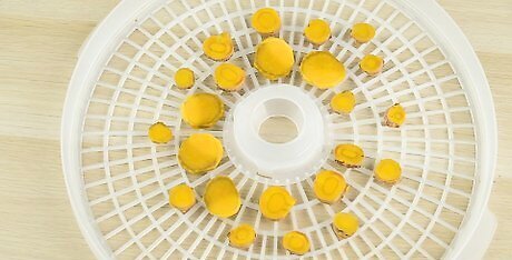 Arrange the turmeric pieces in a single layer on the dehydrator tray. Leave about ⁄2 in (1.3 cm) of room in between the individual pieces. If you run out of room on the tray and your dehydrator can’t accommodate multiple trays, you may need to do separate batches.Variation: If you don't have a dehydrator, you can easily dry your turmeric root in the sun. Spread the chopped root pieces in a single layer on a plate or tray. Then, place the tray in a sunny window and leave it there for 10-15 days. You'll know the roots are ready to grind when they look shriveled and feel brittle.