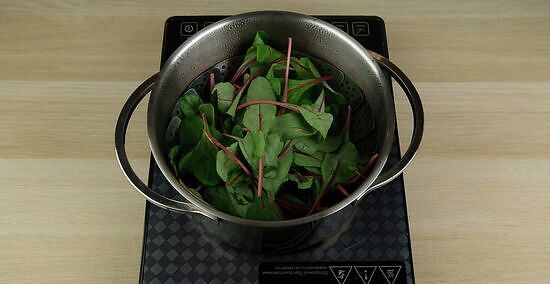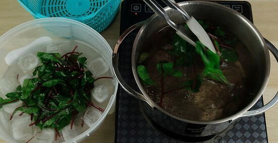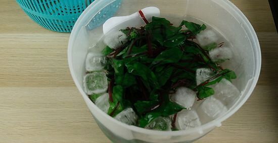 Use tongs to move your chard directly into an ice bath. After your greens have simmered for 30 seconds, transfer the chard into a large bowl of ice water. The water needs to be as cold as you can get it without it being frozen. Do not simply use water from the faucet, as that will not be cold enough.