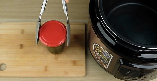 Place the lid back on the pan and let the jars sit for 10 minutes. Do not lock the lid on during this time. You need to allow your jars to gradually cool down before removing them. After the first 10 minutes are up, remove the lid completely from the pan and let it sit for another 10 minutes.