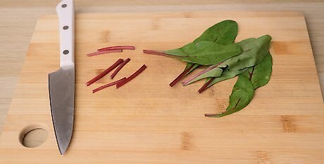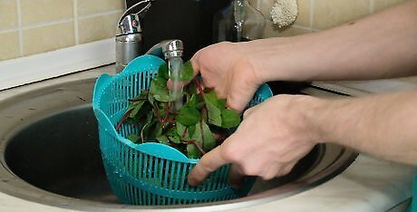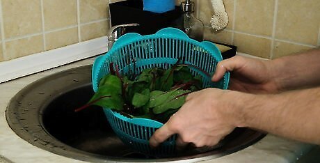 Wash small amounts of the Swiss chard thoroughly. Make sure your Swiss chard is free from any dirt and debris. You can use a tub of warm water to soak the chard for a few minutes and then rinse thoroughly. Make sure that the water draining from the chard is free from any debris.