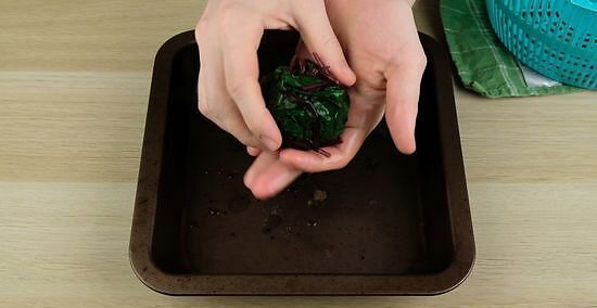 Pack the chard tightly until they form a ball the size of a baseball. Once you are sure you have removed as much excess water as possible, go ahead and gather a handful of greens in your hands and mold them until they are in the shape of a ball. Continue to add chard to the ball until it is between the size of a tennis ball and baseball. The blanching and shocking process will keep the chard slightly damp, making them pliable and easy to mold. Try not to over handle them. The dampness will act as its own adhesive, so you do not need to overwork your chard.