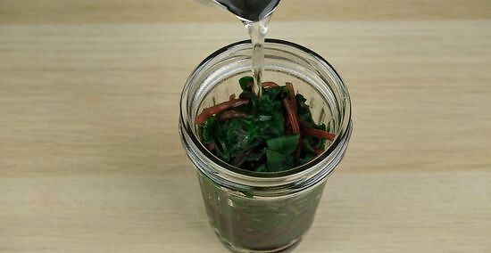 Use tongs to place the steamed chard into a .5 US pt (0.24 L) jar. Do not pack you chard too tightly into the jar. Leave at least 1 in (2.5 cm) of space between the top of your chard and the lid of the jar. For larger quantities you can use a 1 US qt (0.95 L) canning jar, but remember to still 1 in (2.5 cm) of headspace.
