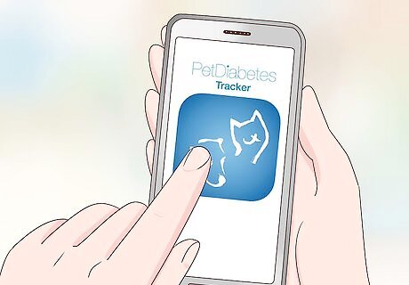 Download a pet diabetes app. To make managing your cat's diabetes simpler, download a pet diabetes app for your phone. Such an app can help you develop a regular schedule around meals and injections, monitor your pet's glucose levels, track its food and water consumption, set alerts, and record and relay information to your veterinarian. Pet Diabetes Tracker, for instance, is a free app available for iPhone, iPad, and Android.
