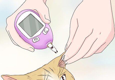 Use a blood glucose monitor to test your cat. Keep track of your cat's blood sugar at home by using a blood glucose meter. These meters use blood procured from a tiny prick to your cat's ear to assess glucose levels. Brace your cat gently but firmly with one arm before taking blood, and praise and pet it for its cooperation. At-home monitoring should be undertaken only with your vet's permission. They will show you how to administer the test, and they will need regular updates on the results so that they can interpret the data and adjust treatment as necessary. Another way to measure your cat's blood glucose is to test its urine with urine dipsticks (available from your veterinarian).