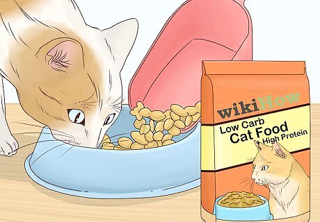 Feed your cat controlled meals. An important part of managing diabetes is keeping your cat's diet healthy and consistent. Feed your cat the same amount of food at the same times each day to control its blood sugar. If necessary, set alarms on your smartphone to make sure you remember when to feed your cat. Opt for high protein, low carb cat food (e.g. canned food instead of dry cat food). Alternatively, you can also get a prescription food from your vet. The amount that you feed your cat should be determined based on its size and energy output (e.g., a cat with reduced mobility will require less food than a playful, active cat).