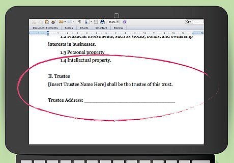 Choose a trustee. The trustee manages the assets in the trust. With a revocable trust, you will likely be the trustee during your lifetime. You will need to choose a successor trustee to take over once you die or otherwise become incapacitated. Unless you have a complicated trust, you will probably choose someone you know, such as a spouse, child, or other relative. If your estate is large or complicated, then you should have your estate attorney help you identify professional trustees you can hire. You can name more than one successor trustee. For example, your spouse might be your first choice. However, since he or she is probably near your age, you might also want to name a second successor trustee from a younger generation.