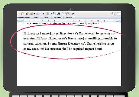 Include other information. A will contains other important information, such as who will serve as your executor (“personal representative”), who will become a guardian for your minor children, who will provide for your pets, etc. Don’t forget to include this information as you complete your will. See Create a Will for more information.
