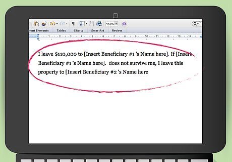 Name specific beneficiaries. As part of creating the will, you need to identify property and name a person to receive it. This person is the “beneficiary.” You can name an individual or an organization, such as a charity, as the beneficiary. You are under no obligation to leave property to family. You should always create a back-up beneficiary in case your initial beneficiary dies before you. For example, you could leave your home initially to your sister but, if she dies before you, then you can leave it to a nephew. You can write: “I leave my home to Joan Smith. If Joan Smith does not survive me, then I leave this property to Michael Jones.”