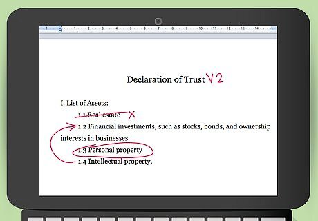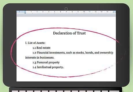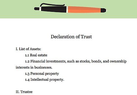 Identify your assets. A trust is a legal arrangement in which someone holds property for someone else. You can use a trust in the place of a will or to supplement a will. Accordingly, you can put all of your property into the trust and hold them in the trust for the benefit of your beneficiaries. You should first identify your property and consider whether you want to include it in the trust: Real estate, including your primary residence and any other real estate that you own an interest in. Financial investments, such as stocks, bonds, and ownership interests in businesses. Personal property. Personal property is property that is movable. This includes furniture, valuable works of art, jewelry, etc. Intellectual property. If you have patents, trademarks, or copyrighted work, then you can also put them into the trust.