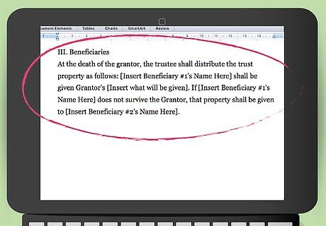 Name your beneficiaries under the trust. The beneficiaries receive the property you put into the trust. You can prevent your assets from going to distant relatives by naming beneficiaries who are not those relatives. You can name anyone you want. If you have beneficiaries who are young children, then you should name someone to take care of the property on their behalf.