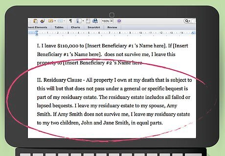 Remember the “residuary clause.” Even small estates contain a lot of property, small things like your DVD player, your clothes, and your kitchen table. Rather than name a beneficiary for each small item, you can include a “residuary clause.” The residuary contains all of your property minus what you have specifically left to beneficiaries. It is important that you name a residuary beneficiary. This person will get everything you haven’t gifted to a specific beneficiary. You can write, “All property I own at my death that is subject to this will but that does not pass under a general or specific bequest is part of my residuary estate. The residuary estate includes all failed or lapsed bequests. I leave my residuary estate to my spouse, Amy Smith. If Amy Smith does not survive me, I leave my residuary estate to my two children, John and Jane Smith, in equal parts.”
