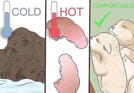 Observe how the puppies lie within the nesting box. The way the puppies lay in the nesting box will let you know if they are comfortable, too hot, or too cold. If the puppies are piled on top of each other, they are cold and using each other to stay warm. If they’re spread far apart, the puppies are too warm. If they’re lying next to each other, they’re comfortable.