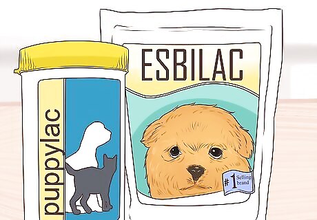 Purchase a commercial puppy formula. After their first day of life, the orphaned puppies will need puppy formula to keep them healthy and prevent disease, since they won’t be able to get milk from their mother. High-quality commercial puppy formulas are available at pet stores, and maybe at your vet’s office. Examples of high-quality commercial puppy formulas are Esbilac® and Puppylac®. If you cannot get purchase puppy formula right away, make an emergency puppy formula at home. Mix one cup of milk, one tablespoon of corn oil, one pinch of salt, and three egg yolks (no whites) in a bowl. Feed the emergency formula until you can purchase commercial puppy formula.