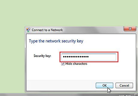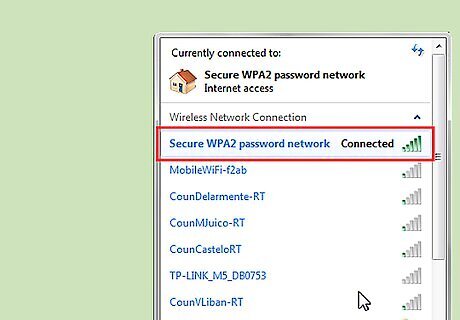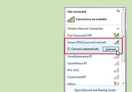 On the lower right hand of the taskbar, click on the "Network" icon (denoted by the signal bars) to see the list of available wireless networks. Then, click "Connect" on your desired security-enabled network. In Windows Vista, click the "Start" button, then "Connect to." A list titled "Show" will appear. Click on "Wireless." For Windows XP, click on "Start." Go to "Control Panel," then choose "Network and Internet Connections." Select "Network Connections." Look in the left pane of the window for "Network Tasks." Click on "View available wireless networks" below it.