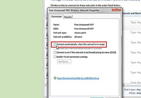Make sure that the box next to "Connect automatically when this network is in range," is not checked. Then click on "OK" to save your settings. Repeat the steps to uncheck the box for any other unsecured networks on the list.