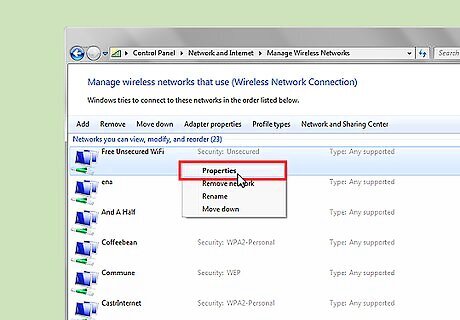 Look for those networks where the Security is "Unsecured." Right click on an Unsecured network, then click on "Properties."