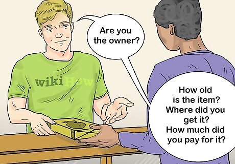Ask the seller if they are the owner. When someone comes to your business to sell goods, then you cannot just accept the goods without asking any questions. Instead, you should ask basic questions to feel out whether the person is the real owner. If the goods are stolen, then the police will want to see that you performed a reasonable inquiry. Ask how old the item is. If they don't know, then they may have stolen the goods. Ask where they got the item. If they can't, or if they stammer and stumble, then the goods might be stolen. Ask how much they originally paid for the item. If they give you a price that seems too low or too high, then you should be on guard. The goods may be stolen.