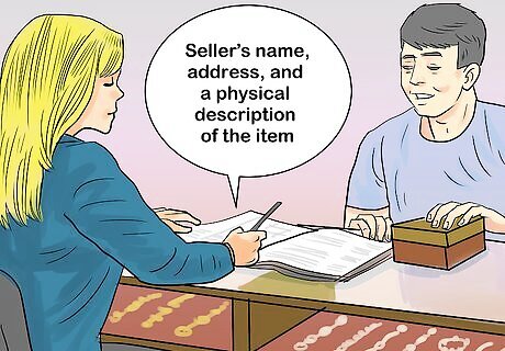 Write down important details about the seller. Your state law may require that you take down important information about the seller. It is probably a good idea to do so even if your state law doesn't require you to. For example, you should take down the following: seller's name seller's address physical description of the item