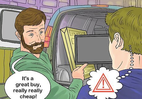 Refuse to buy anything that looks suspicious. More likely no one will tell you that the goods are stolen. However, either the goods or the sale might be suspicious. In this situation, you need to avoid buying the goods. Willful blindness won't protect you. Don't buy goods out of the back of a van. A reasonable person wouldn't expect to purchase a television, jewelry, or a gun from the back of a van in an alleyway. If you do, then you could be charged with receipt of stolen property if the property was, in fact, stolen. Be suspicious of goods sold very cheaply. For example, someone might advertise to sell their new car for a very cheap price. You should be suspicious that a new car is being sold so cheaply. Check if the goods have a name on them. If so, check that the name matches the seller's name. When the name doesn't match, then you should suspect the goods were stolen.