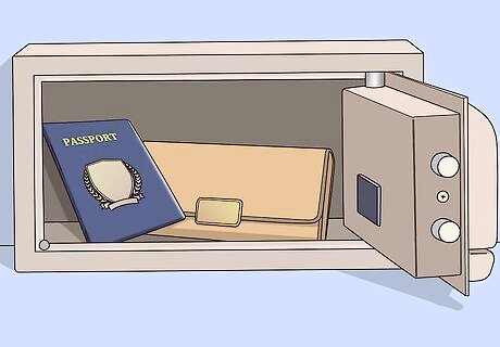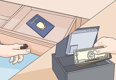 Stash passports, cash, and credit cards in separate places. Keep a little cash and your credit cards in a wallet or purse. Then, keep additional money and cards in a pocket or money pouch. You can also stash a little more cash in your checked luggage or your carry-on. That way, your money and important documents aren't all together in one place. Carry your passport separately from your money and credit cards when you're flying. When you get to the hotel, lock your passport in the hotel safe. Unfortunately, hotel safes aren't 100% foolproof, so you may want to carry the items on your person if you're concerned about theft. Make copies of important documents, IDs, and credit cards in case you lose them.