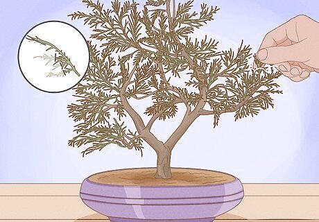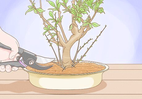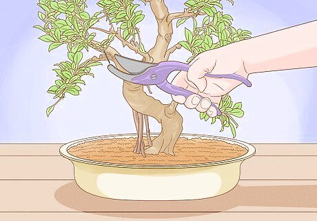 Trim crossed and broken branches. Crossed branches rub on each other and leave wounds that may allow pests or diseases into the wood. Broken branches or twigs should be removed to allow the tree to direct its energy toward new growth. Use bonsai branch cutters to cut crossed and broken branches off just above the point where they extend out from the trunk of the tree.