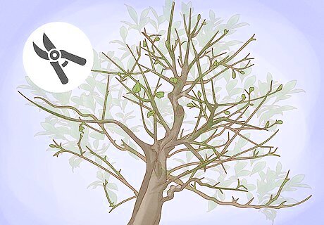 Thin out the crown and canopy. To allow light to filter through the canopy and reach the lower branches, as well as to shape the canopy to the desired size, trim back the branches or twigs on the top of the tree. Use branch cutters to trim down overgrown branches and shoots so the canopy is rounded and balanced.