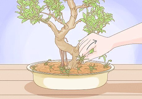 Remove all the weeds and dead wood or leaves. Look for weeds growing in the bonsai pot as well as dead twigs or leaves on the tree itself. Carefully pluck out the weeds, making sure not to damage the roots of the bonsai. Pick dead twigs or leaves off of the tree and discard them.