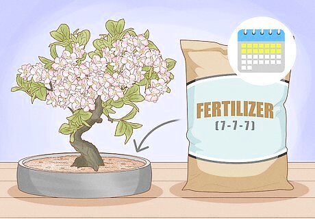Apply a 7-7-7 fertilizer every 2 weeks while the tree is actively growing. Choose a fertilizer made specifically for bonsai trees, such as a 7-7-7 fertilizer. Use liquid fertilizer for small bonsais, and granular fertilizer for large bonsais. Dilute the fertilizer to half strength, or use half as much as directed on the package.