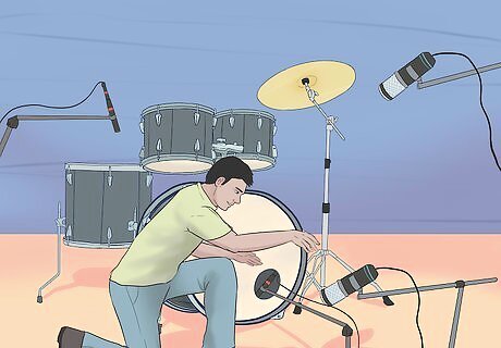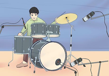 Test the drums and microphones for sound quality. Before you begin playing, give your drum kit a test run. Strike all the drums as you would while playing. Make sure they sound full and tuned properly. Play back the recordings to hear what the microphones are picking up.