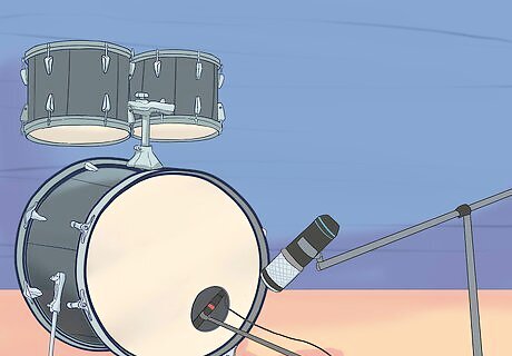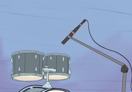 Set up a dynamic microphone between the smaller tom-toms. Unless you are using multiple mics, position a dynamic mic on a stand near the front side of the drum kit between the 2 toms over the kick drum. Keep the mic 4 to 6 in (10 to 15 cm) from the heads. Point the mic towards the drummer. If you are able to set up multiple mics, you can place them over each drum. Position the mics like you would with a snare drum, letting them hang over the drum head. You may use condenser or ribbon mics, but these can be overloaded by loud playing.