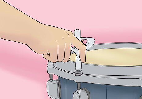 Tune the drums to the perfect sound. Use a drum key to tighten the tension rods on all of the drums. Both sides of each drum need to be tuned evenly and in concert with the other drums. Aim for clear, even tones from the drums and continue adjusting them to get the sounds you desire. Use the key to loosen the tension and change out the drum heads. All drum heads produce different sounds, so they are an essential part of tuning.