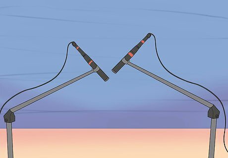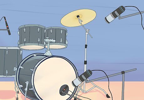 Place an overhead microphone behind the drum kit. Overhead mics record the whole range of your drum kit. If you only have enough money for 1 mic, start with a condenser mic. Try placing it on a stand over the drummer's shoulder, pointing down towards the kick drum. Raising the mic causes your drums to sound somewhat distant. Lowering it can cause 1 of the drums to sound louder. If you have 2 overhead mics, try placing them back to back behind the drummer or on either side of the drum kit.