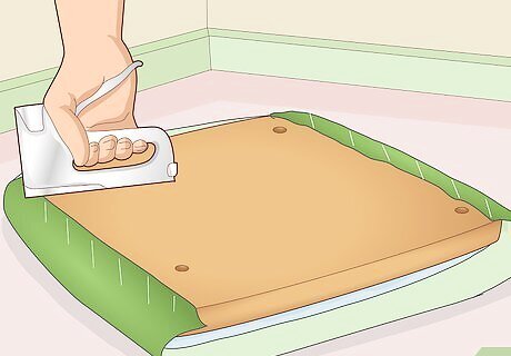 Test your fabric by holding it over the cushion to ensure that it fits. To make sure that your cuts are accurate, hold the cushion over the foam pad and seat. Fold the fabric temporarily underneath the chair to ensure that your new upholstery will fit. So long as you have some excess fabric to work with underneath the seat on each side, you’re ready to install the fabric. If your fabric doesn’t fit, cut a new outline out. Add length to each side as needed to completely cover the cushion.