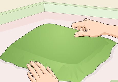 Fold one side of the fabric over the bottom of the seat and staple it. Press down on your cushion a little to brace it with your nondominant hand. This will keep it still while you make your first fold. Use your dominant hand to lift the center of the edge up over the cushion. Hold it in place and move your nondominant hand over to the fold to press it into the cushion. Grab a staple gun and staple the center before applying more staples to the left and right of the center. Leave the last 3–4 in (7.6–10.2 cm) near the edge unstapled. This way you’ll be able to fold the corners over when you’re done. For a round cushion, pinch the fabric together while pulling it over the edge of the cushion so that it stays tight. Start by completing roughly 1/4 of your fabric on any side. Place 1 staple every 1–2 inches (2.5–5.1 cm) along the rim of the cushion.
