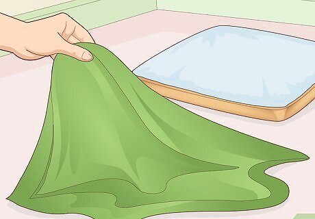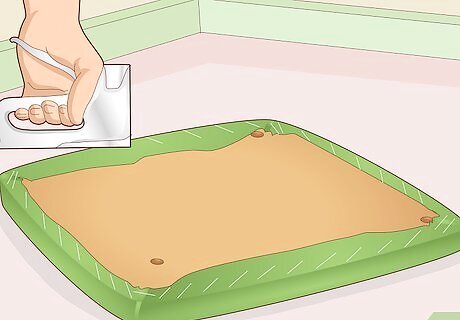 Place your fabric upside down a flat surface. Lay your cushion upside down on top of the fabric. Place your foam pad on top of the fabric with the cushion on top of the foam pad. Place each piece in the center of the material. Adjust the fabric as needed so that it’s flat and centered on top of your seat. If you left the foam pad attached to your cushion, place it upside down so that the bottom of the chair is facing up.