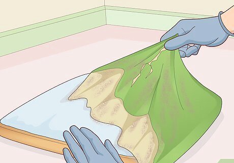 Pry the old fabric off of the old cover if it won’t come off. If the fabric won’t come up after you remove the staples, put on a thick pair of gloves to avoid cutting yourself on any screws or nails you may have missed. Carefully pull the upholstery off by ripping it off of the glue or internal staples. If it is stapled into the frame under the foam padding, use a screwdriver, utility knife, or angled scraper to remove the staples. This step can be kind of messy since it’s hard to know what’s keeping your cushion in place. There may be internal staples or glue that you simply can’t see. If you think you’re going to destroy the cushion by removing the old upholstery, recover your cushion by adding fabric on top of the old cover. If you’re only adding a new cover over your old upholstery, skip this step.
