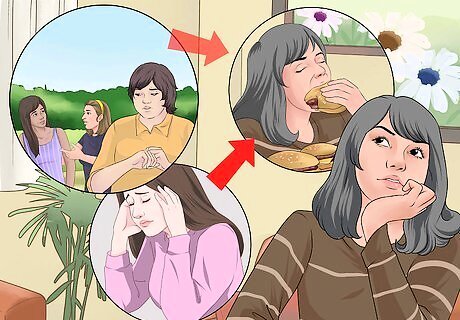 Understand the emotional experiences of BED. Binge eating is often done in secret and will cause shame and guilt. To cope with these negative emotions, the sufferer may engage in further binging. This starts a vicious cycle that will continue until healthier coping strategies are developed. Eating may distract from or reduce negative emotions, but these benefits are temporary.