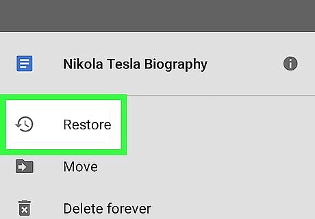 Tap Restore. The document is now restored to its original location. Repeat this method to restore additional files. This will work for other types of file in your Drive, including spreadsheets, photos, and slides presentations.