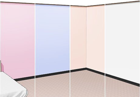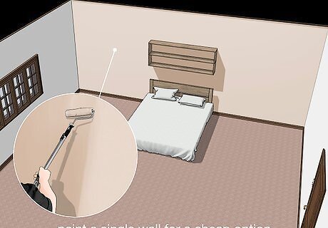 Paint a single wall or even a single stripe for a cheap option. If you can't afford much paint, don't worry. Try painting an accent wall, for instance. You can even just paint a large stripe down the wall behind your bed as a focal point. These options don't take much paint, but they can make a big difference to your room. Make sure to use painter's tape to block off the area you want to paint. That way, you won't go out of the boundaries you set. Buy paint on sale or that's been mixed wrong if you want to paint the whole room. If the store doesn't mix the color right, it has to do it again. The "mistake" paint is usually then put on discount. You can find a variety of colors, but you have to go with an open mind, as you'll have fewer options. You can also look for paint sales, which often happen around holidays, particularly during the summer.
