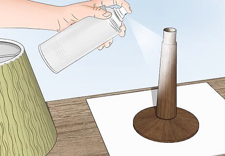 Update old lamps with spray paint. Pick a spray paint that's meant for the material of the lamps, such as one meant for metal if they're brass. Take the lamp apart, and then use the spray paint to add a new color to the lamp! Put the lamp back together when you're done. This works best for standard table lamps with a lampshade. Make sure to take the lampshade off. Always spray in a well-ventilated area, holding the spray paint at least 6 inches (15 cm) from the surface. Keep moving the can when spraying to get an even coat. You may need to do multiple coats. For a smoother finish, try wet sanding the paint with a very fine grit wet sandpaper once the paint is dry.