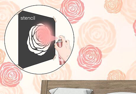 Use stencils or paint a mural. Pick up a set of stencils, and use them to create a design on part of your wall. For instance, you could create a large floral arrangement, a funky collection of animals, or a series of feathers. Sketch the design out in pencil first to be sure you like it! You could also use acrylic paints to draw something fun on one wall or in one corner. Alternatively, try adding a series of shapes up a wall in 1 or 2 colors, such as hearts or diamonds.