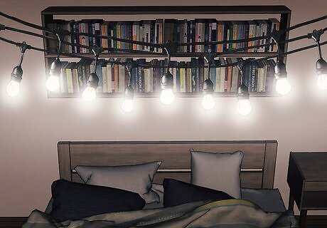 Scatter some cheap lighting around your room. If all you have is a harsh overhead light, add some lamps and wall lighting to make your room feel cozier. Even a cheap string of patio lights strung along the top of your headboard can add a romantic feeling to your room. Also, try adding some small desk lamps in various places or a cheap kit that you attach to the wall, such as a colorful paper star lantern.