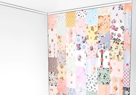 Cover all or part of a wall in paper. Buy pretty scrapbook paper or tear up a used book that's seen better days. Then, you can either use double-sided tape or a cornstarch paste to adhere the paper to the wall. You can cover a large area with book pages. Both of these fixes are temporary, so you can take them down and redo them when you want!