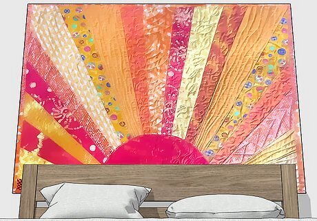 Hang up a colorful quilt, sheet, or blanket on 1 wall. Many quilts and sheets have pretty patterns that can make a colorful statement. Try centering one behind your bed to create a focal point for your room, for instance. You can nail or pin up the fabric if you don't mind putting a few holes in it. You can also safety pin it around a curtain rod, then hang the rod from hooks.