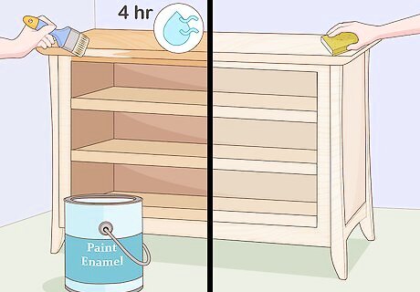 Cover your dresser with traditional paint for a durable finish. Coat the entire dresser with a layer of acrylic or enamel paint and let it dry for between 2 and 4 hours. Then, apply a second coat of paint and, once dry, rub it gently using 240-grit sandpaper. Repeat the process until you have a minimum of 4 layers, sanding after each coat except the final one. For a standard matte finish, use water-based acrylic paint. For a longer-lasting and glossy finish, use enamel paint instead.