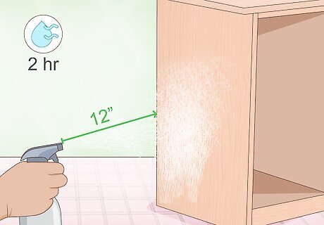 Spray paint your dresser to make the process quicker. Purchase a can of universal or wood spray paint in whatever color you desire. Hold the can between 8–12 in (20–30 cm) away from the dresser's surface, then spray on a coat of paint using large, sweeping motions. Let the paint dry for about 2 hours, then add another coat. Repeat the process until you're happy with the finish. When using spray paint, make sure to wear a protective dust mask and safety gloves. Spray paint takes less time to apply than traditional paint, but it offers far less protection.