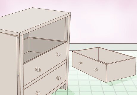 Empty your dresser and take out the drawers. Before starting the refinishing process, clear your dresser of any personal items. Then, remove your dresser's drawers and, if possible, take off any additional attachments like handles. You can replace or reattach these after your new finish dries. To remove your dresser handles, take out the screws holding them in place and carefully pull the handles out of the wood case. Make sure to store your handles with their respective screws.